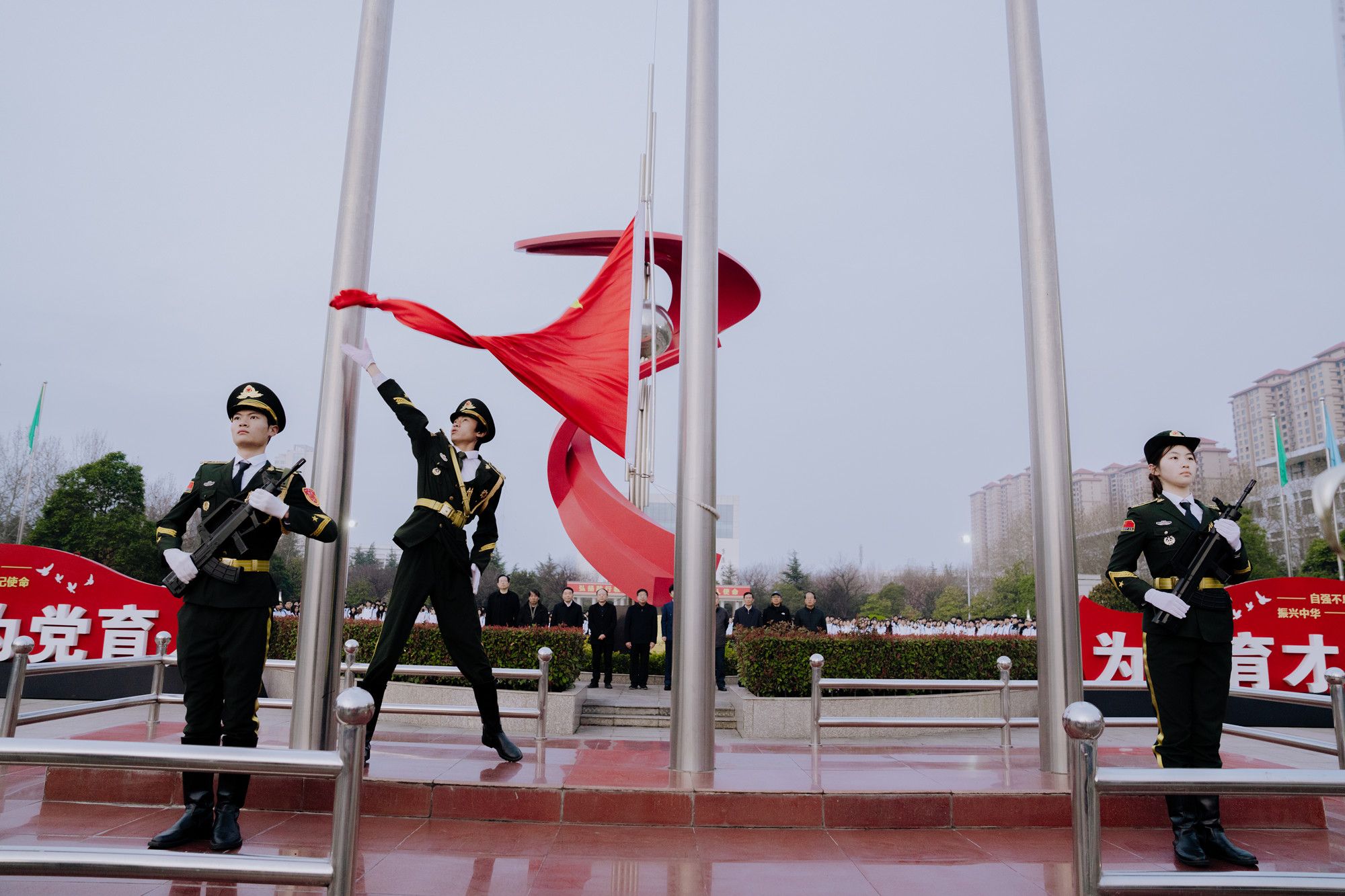 陕服新闻网讯(李文斌)3月16日清晨,我校在和谐广场举行3月份升国旗仪式。学校董事长吕明、校长姜寿山、党委书记王岗及在校校级领导、师生代表万余人齐聚广场,以国旗为誓,吹响新学期奋进的号角。6时50分,国旗护卫队护送五星红旗入场。升旗手振臂展旗,鲜艳的五星红旗迎着晨光冉冉升起,在微风中猎猎飘扬。全场师生肃立致敬,目光灼灼望向国旗,雄壮的国歌声响彻校园,大家齐声高唱,以最真挚的情感礼赞祖国,以最庄严的仪式开启新学期奋斗征程。...