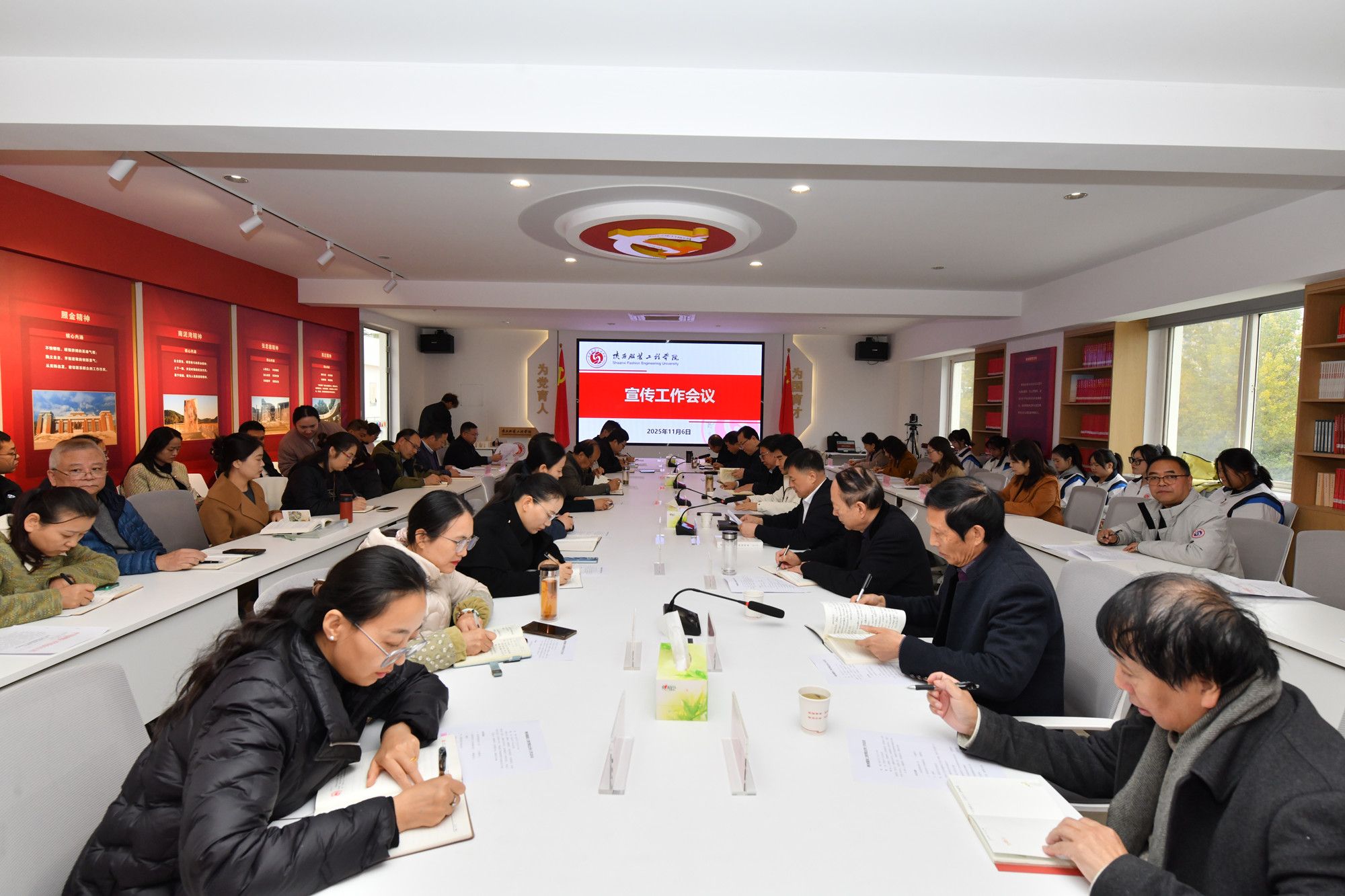 刘继兵作学校宣传工作报告。他指出,2023年以来,学校宣传思想文化战线坚持以习近平新时代中国特色社会主义思想为指导,全面贯彻落实党的二十大和二十届二中、三中、四中全会精神,深入学习贯彻习近平文化思想,围绕中心、服务大局、稳中求进、守正创新,完善学校宣传思想文化工作体制机制,巩固意识形态领域向上向好态势,营造了良好改革发展环境,为学校教育事业高质量发展、有力有效服务教育教学就业提供了坚强支撑。下一步,学校将在夯实宣传阵地建设、创新重大主题策划、深化教育融媒建设、构建立体式融媒体传播矩阵建设方面继续发力,持续提高校园新闻的策划、选题、采写和编辑能力,着力加强管理、驾驭自媒体的能力,进一步加强对外宣传能力,在中央级媒体、省级媒体和行业媒体加大曝光率和影响力。