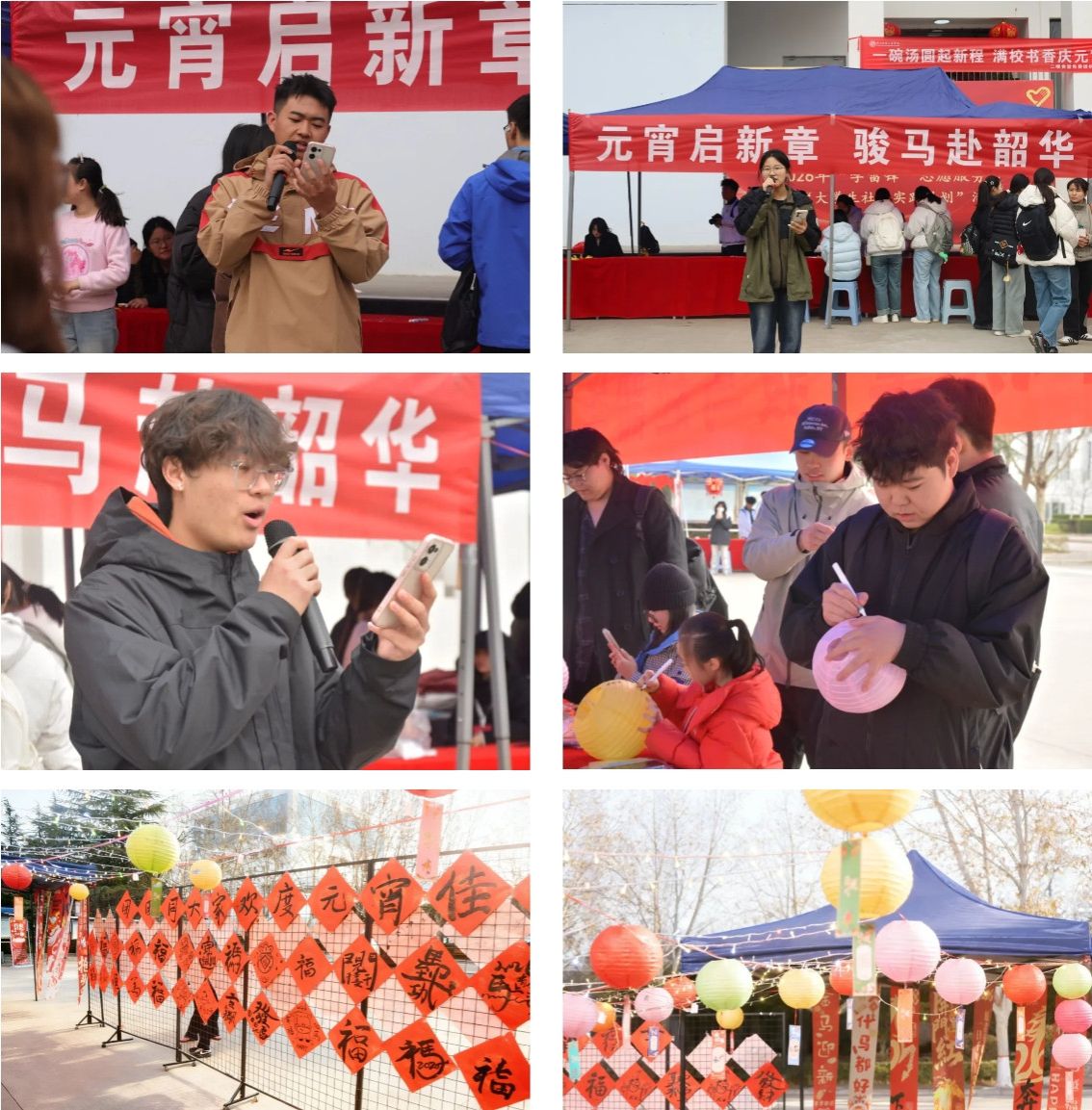活动现场气氛热烈、人气高涨。学校大学生艺术团的同学们现场演唱,悠扬的歌声为活动增添了青春活力。猜灯谜、手绘花灯、书写福字、趣味投壶等项目极受欢迎。一条条融入传统民俗和校史校情的趣味灯谜悬挂于红彤彤的灯笼之下,将活动现场化作一片欢乐的海洋,师生们在墨香与欢笑中迎接元宵佳节的到来。“金马助箭,壶内乾坤”投壶游戏参与的师生络绎不绝。“扎花灯·绘马韵”活动现场,师生们手持画笔,在纸灯笼上精心描绘马年元素与吉祥图案。金马送“福”摊位前墨香四溢,师生们挥毫书写福字,一笔一划都饱含着对新年的美好期许。