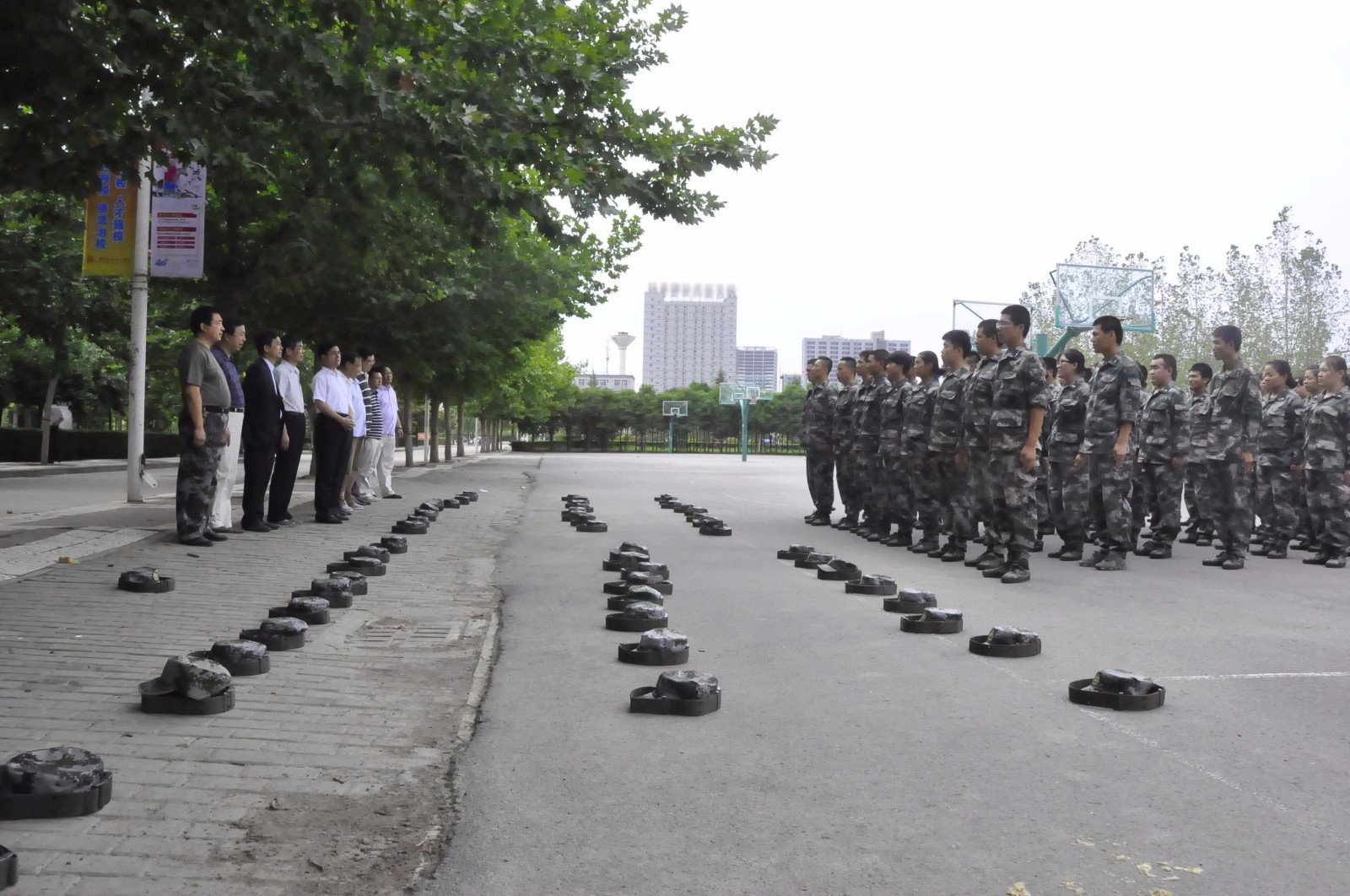 在对购物中心、学生公寓、洗浴中心及正在施工的学校田径场等一一检查后,领导们来到正在紧张训练的军训教官训练场,向冒着高温酷暑依然坚持训练的教官们表示慰问和感谢。吕明董事长说:“国防教育是新生入学的第一课。你们是学校的第一张脸面,是新生的第一位大学老师。希望你们在训练科目中要严格要求他们,在生活上要像爱护弟弟和妹妹一样关心他们,在思想上要正确引导他们。把你们优良的作风、优秀的自理能力和管理能力教授给他们,让他们用自强不息,顽强拼搏精神要求自己,让励志践行的校训陪伴他们创造属于自己的辉煌人生。”