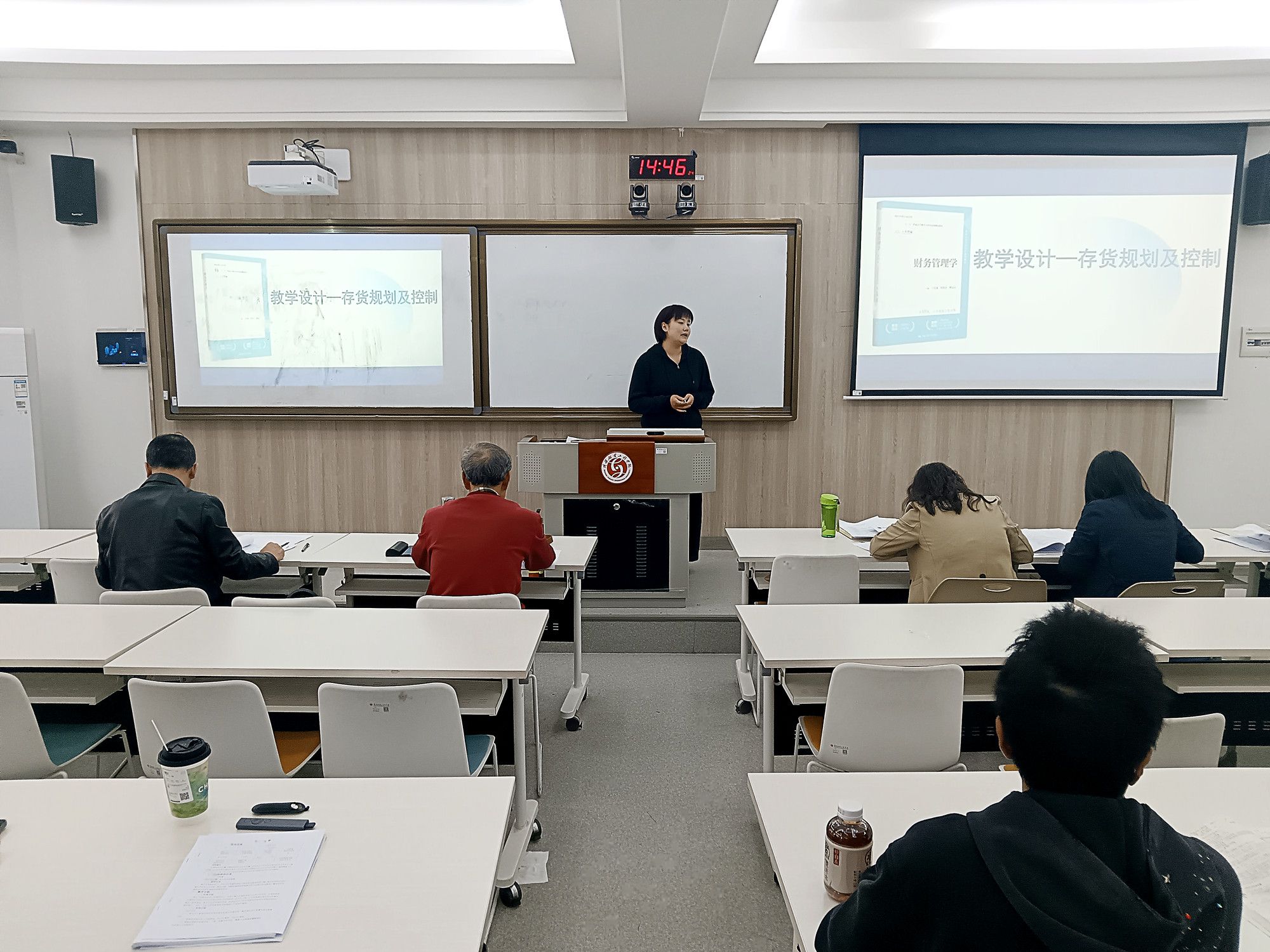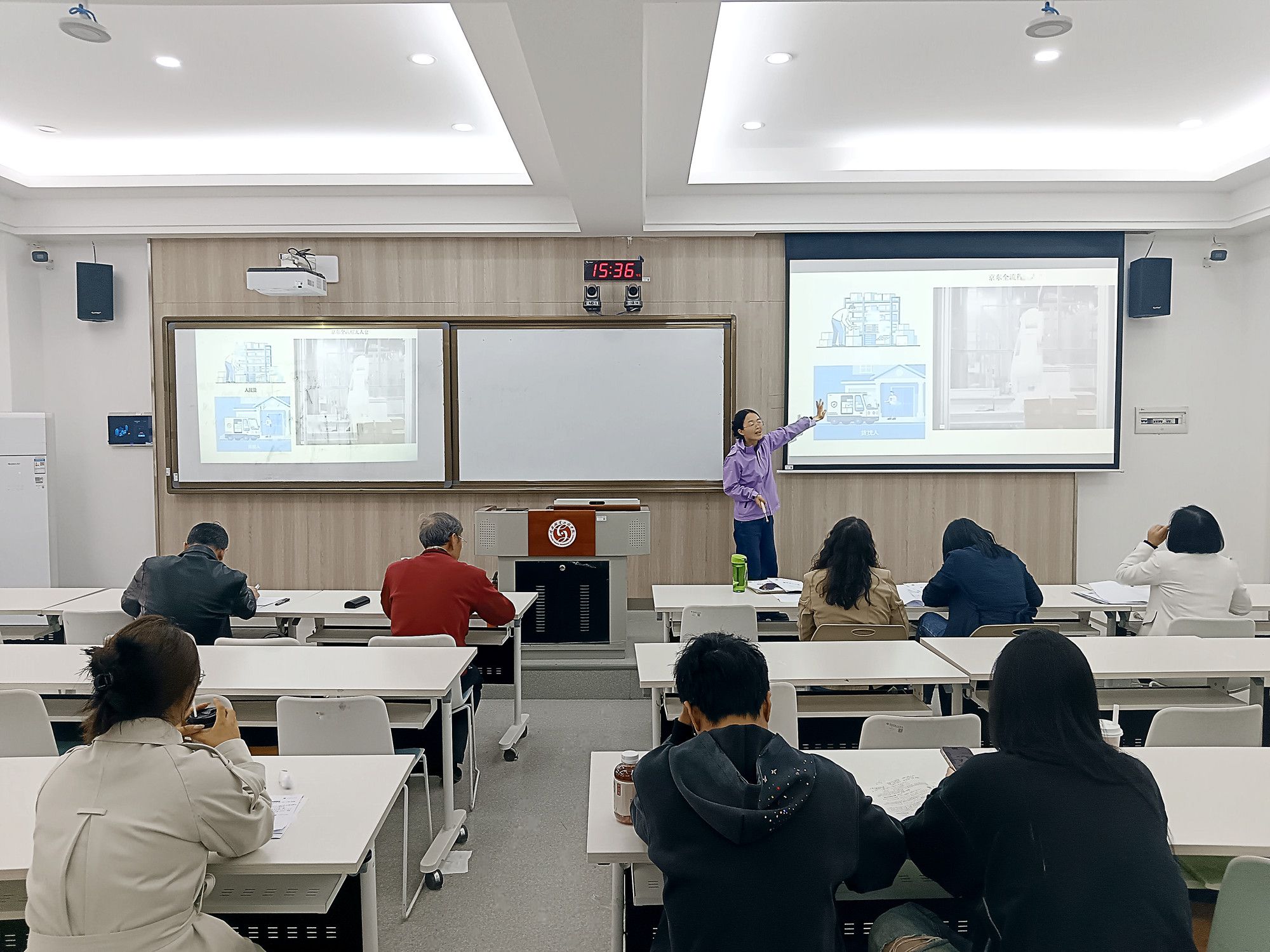 为保障选拔公平专业,竞赛分两组同步进行:B209 教室由韩燕雄等五位教师担任评委,A309 教室由杨立社等五位教师担任评委。比赛现场严谨热烈,参赛教师准备充分、精神饱满,在 25 分钟课堂教学展示中,紧扣教学目标,以生动语言、新颖案例和多元教学手段,展现了扎实的专业素养、先进的教学理念及课程思政融入能力,凸显 “以学生为中心” 的导向。